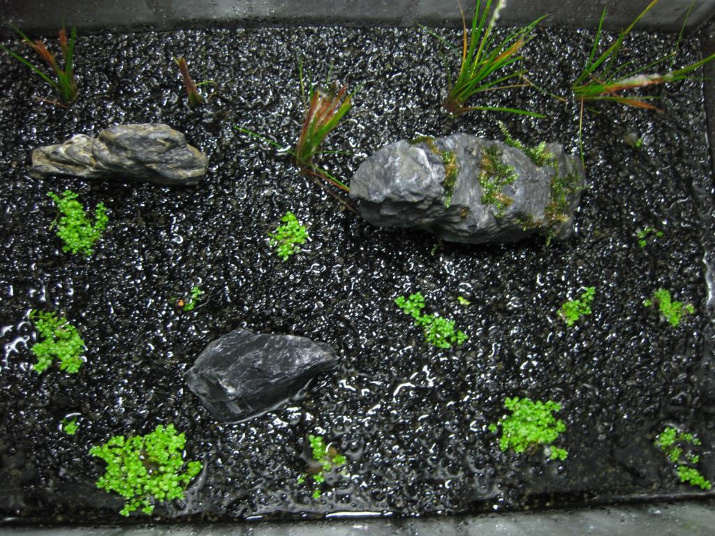 Fyllde akvariet med 1,5 cm jord och 1,5 cm grus på det. I med stenar, sen ca 2,5L vatten behandlat med Easy Life FFM. Planterade växterna. Mossan hackade jag först upp och tryckte sedan fast på den största stenen.
