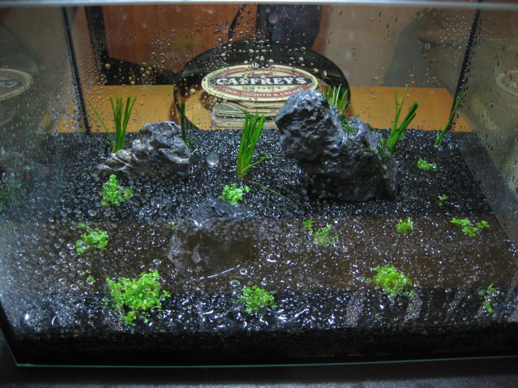 (Vattnet på sidorna av akvariet är inte kondens. Jag försökte använda en blomspruta för att fylla akvariet. Kan inte rekommenderas… )