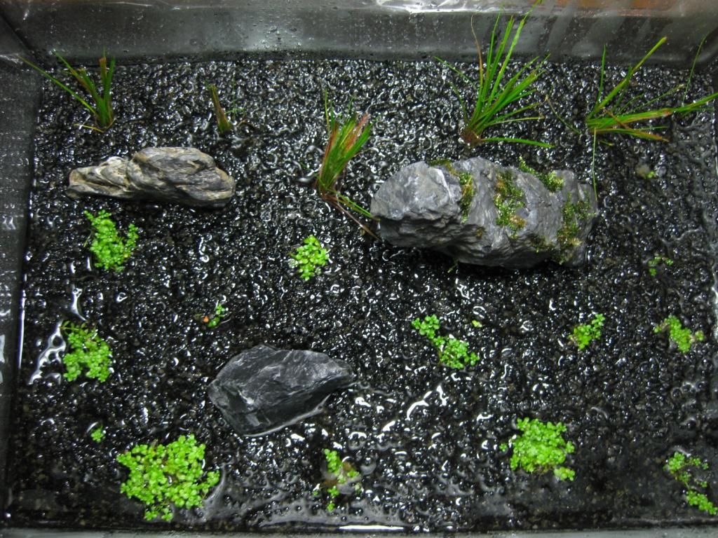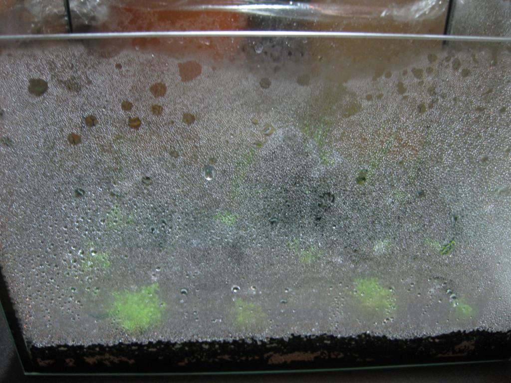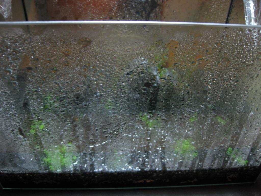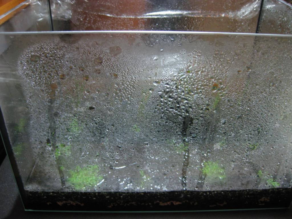 Dags för en uppdatering så här efter första veckan. Jag har verkligen blivit överraskad av hur mycket kondens det är på sidorna av akvariet även så här efter en vecka. Jag har alltså inte tillsatt något vatten under veckan. Så här ser det ut nu (jag drog undan plastfilmen för att fota, annars har det legat på konstant under veckan):
