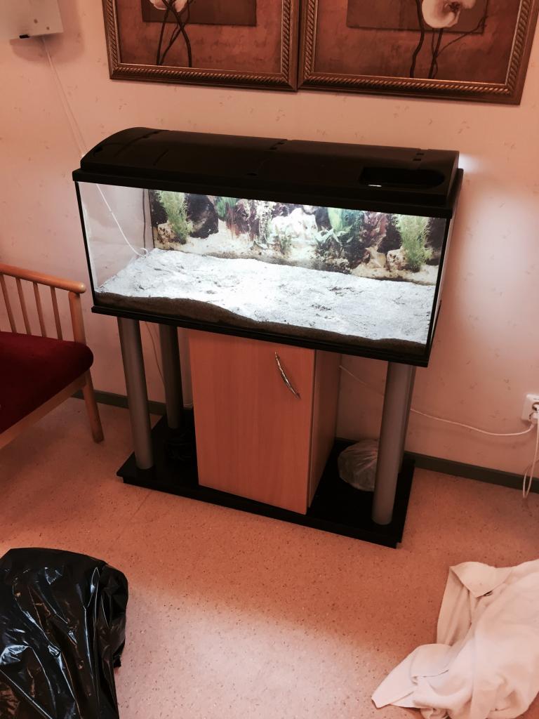 160 liters akvarie, med heltäckande ramp 2 lysrör . Ytterfilter relativt nytt . Möbel . Detta står på min arbetsplats i dalby .