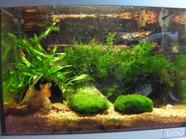 Blev lite ivrig och slängde i 2 kampfiskar & 1 ancistrus. Sen insåg jag att ancistrusen hade för lite mat( nystartat) och kampfiskhonorna gillade inte flytten från 220L. Den ena gömde sig på botten.