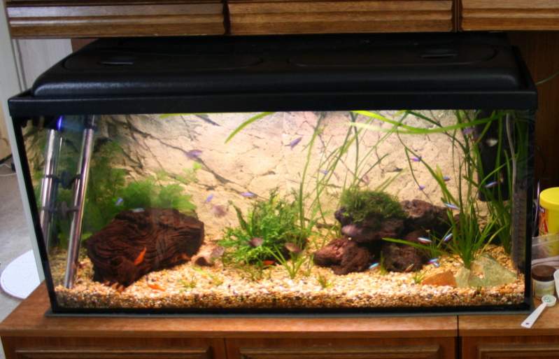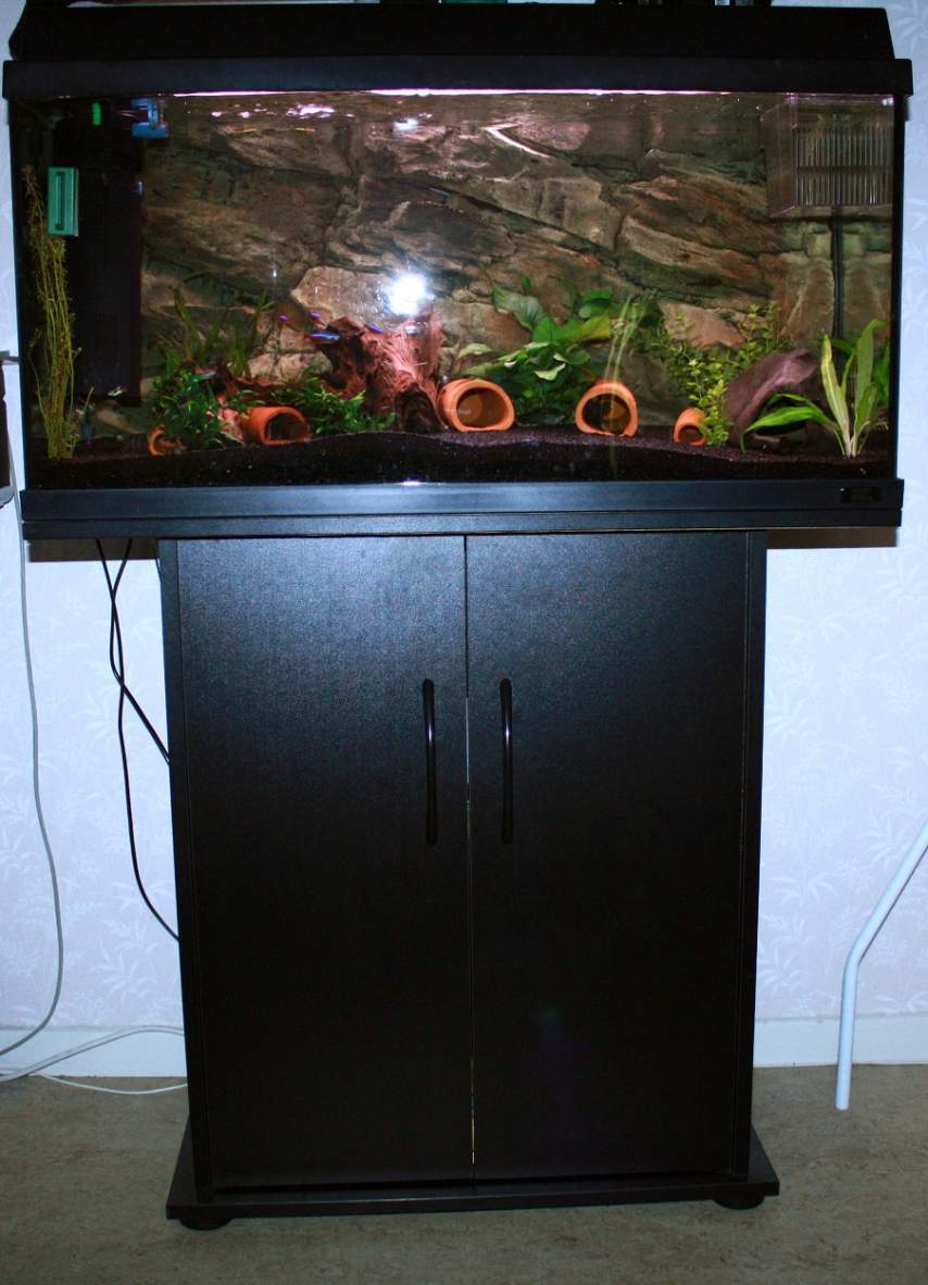 Jag har ett 110L möbelakvarium (juwel) med pump, doppvärmare, BTN- bakgrund och ev. lavastenar och lite ancistrus (brun & guld) & räkor.
