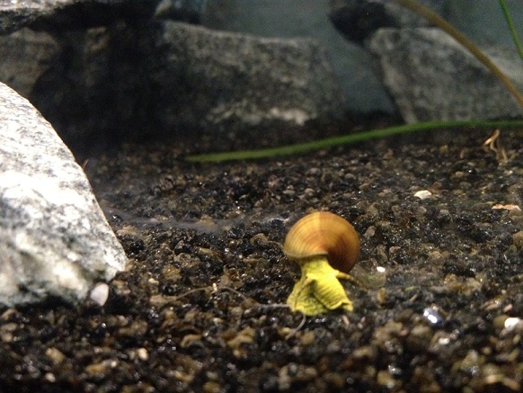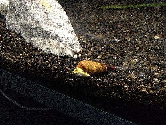 Kan vara en Tylomelania sp. yellow, men det är svårt att avgöra på den bilden, kan du ta en bättre bild där man ser själva djuret bättre:D??
