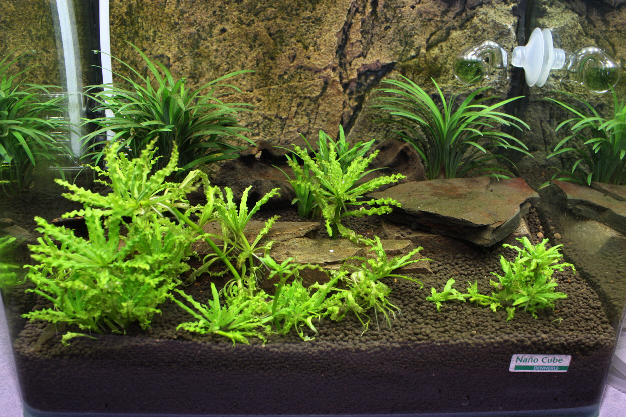 Tror dock att de växterna du har i höger resp. vänster hörn är Ophiopogon sp. dwarf, dvs egentliga övervattensväxter. Kommer sannolikt att dö rätt snabbt. Skifta dem mot någon dvärgsvärdsplanta eller en najs Cryptocoryne så funkar det bättre.