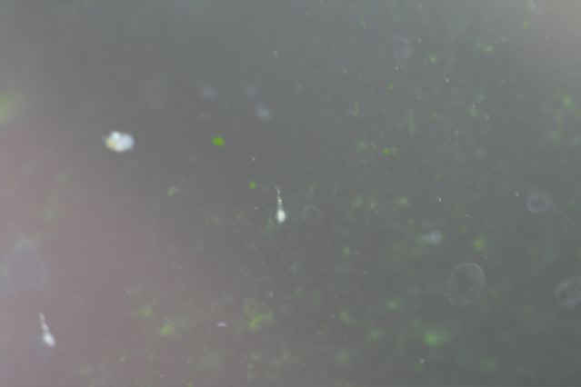 The Nannochloropsis salina culture has arrived. I stored it in the fridge and put a few drops into the saltwater aquarium. The lady is still carrying her eggs.