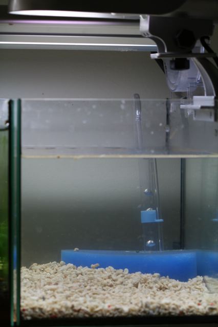 The lady moved into her Exil and the first two days she wasn’t amused. Now she sits on the filter inlet right under the outlet of the hangon filter and filters. I feed her 3 times per day with a pipette.