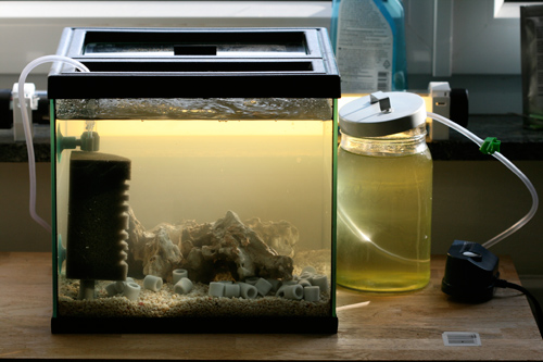 For the next batch of larvae I have converted an old terrarium (28x28x26). The bottom is Coralit and it contains some large pieces of dead coral. I also dropped in a few Siporax pieces to make sure there will be plenty of useful bacteria in the tank. The tank stands closely by the window and will get about 4 hours of direkt sunlight every day. There is also a T8 15W Lamp by the side behind it to let the algae grow. I have an Elite spongefilter with a very gentle airpump running (right now at full power but later only very slightly) so that the water quatily will not get too bad. I might also put in some slight heating so the water doesn’t get too cold during the night. This aquarium will stand there for a few weeks now to get “ready”.