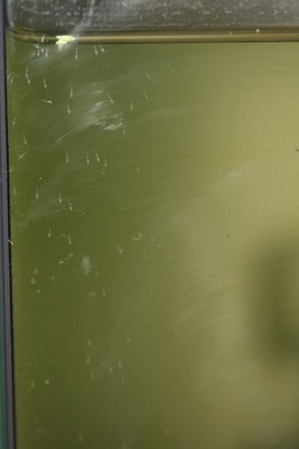 Here is photo of the tank from today. It is a 12l tank and as you can see the water is very nicely green with algae so the larvae have a lot to eat. The light comes mainly from the side so the larvae can more easily feed off the algae on the sideglass.