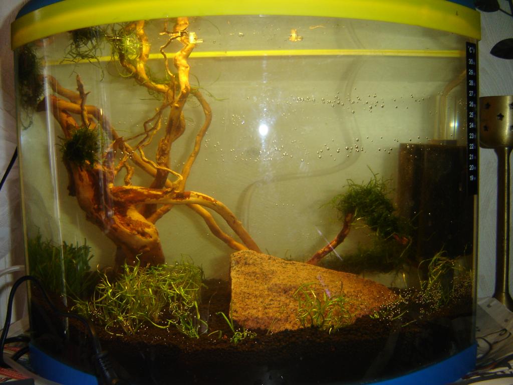 Vid aquascaping är det bäst med platt framruta då det förvränger karet ganska rejält. Tror att det kommer bli fint när mossan växt till sig! :thumbs: