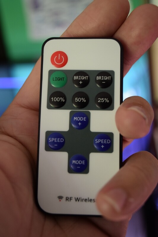 Medföljande trådlösa fjärrkontroll funkar som på/av, samt steglös dimmer eller 25%,50%,100% ljusstyrka, har även en hel del blixt-effekter