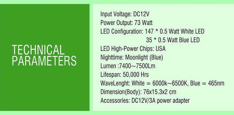 Den ger väldigt starkt ljus vid 100 % och Lumen anges till 7400-7500 Lm, övriga parametrar står i inlagd bild.