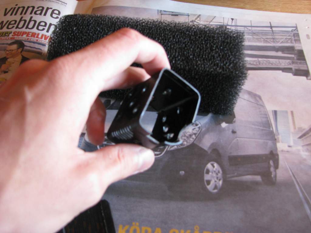 Bild 3. Skär ut formen av filterkammaren i filtermattan och trä på, för att räksäkra filtret tog jag dessutom och tryckte i orginalmattan i mitten så blir det så finporigt att inga räklingar kan ta sig igenom hela vägen.