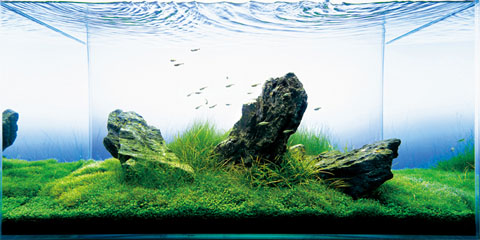 Blev läcker med den blåa bakgrunden (ja, jag ser att det är tapeten i rummet:D). Får lite känslan att akvariet svävar ut i rummet. Förstärker oxå känslan av landskap med himmelsbakgrund.