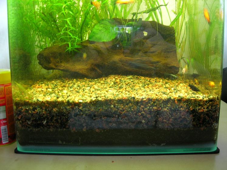 lägg ett 2-4cm tjockt lager på botten och täck med något bottenmaterial 2-4cm ca tänk på att det inte får vara för grovt! då kommer jorden att virvla runt i karet efter ett tag.