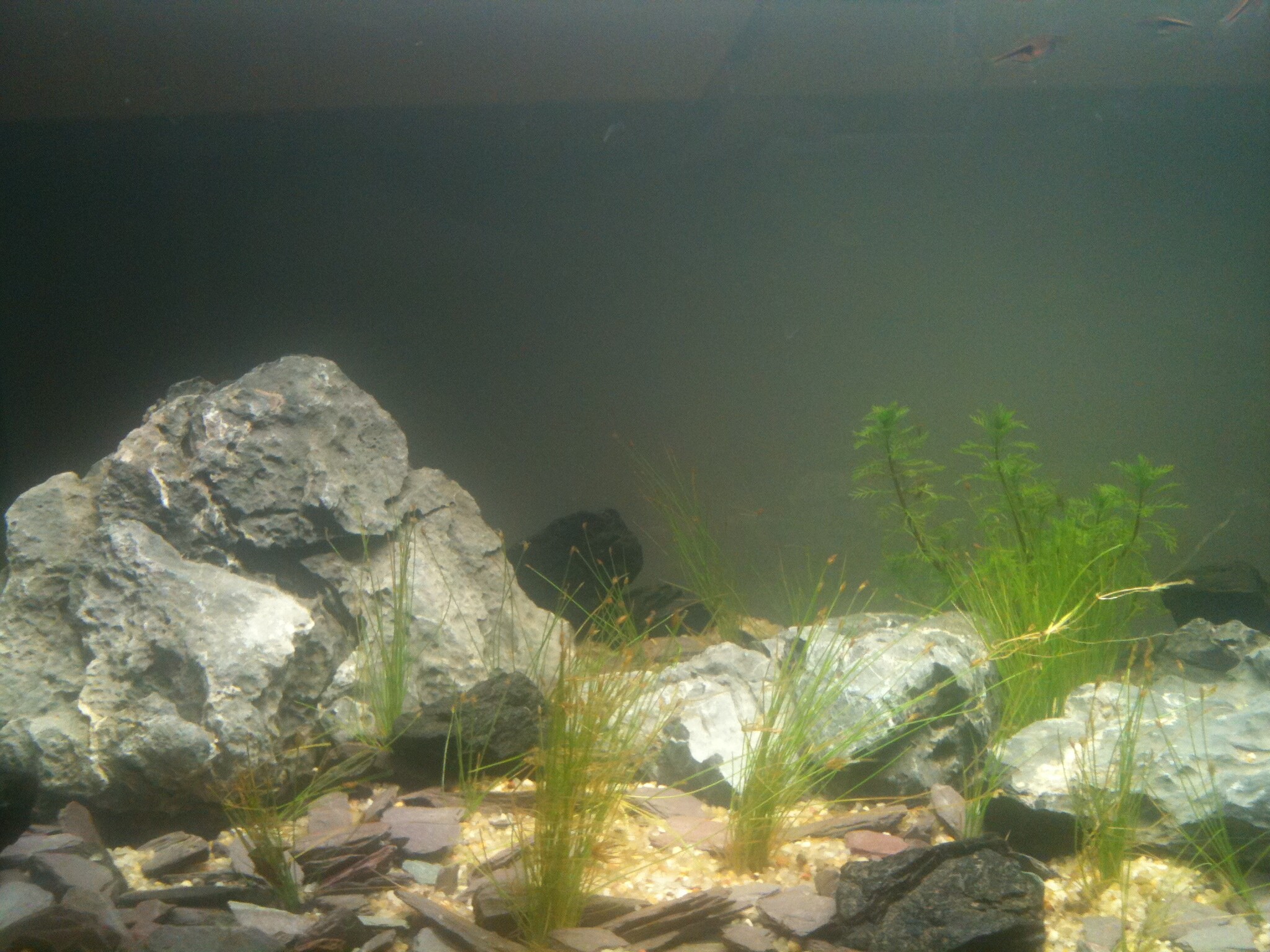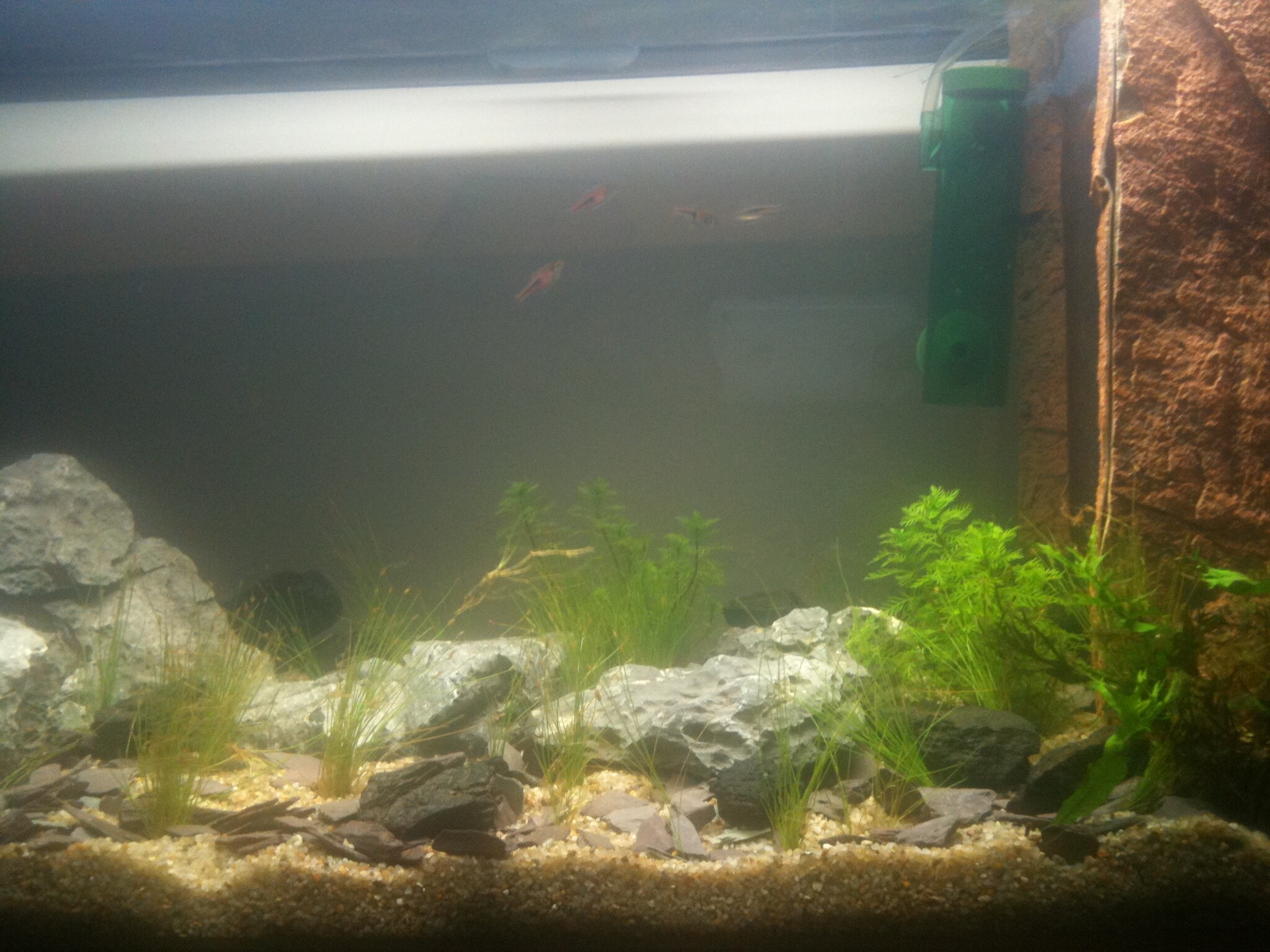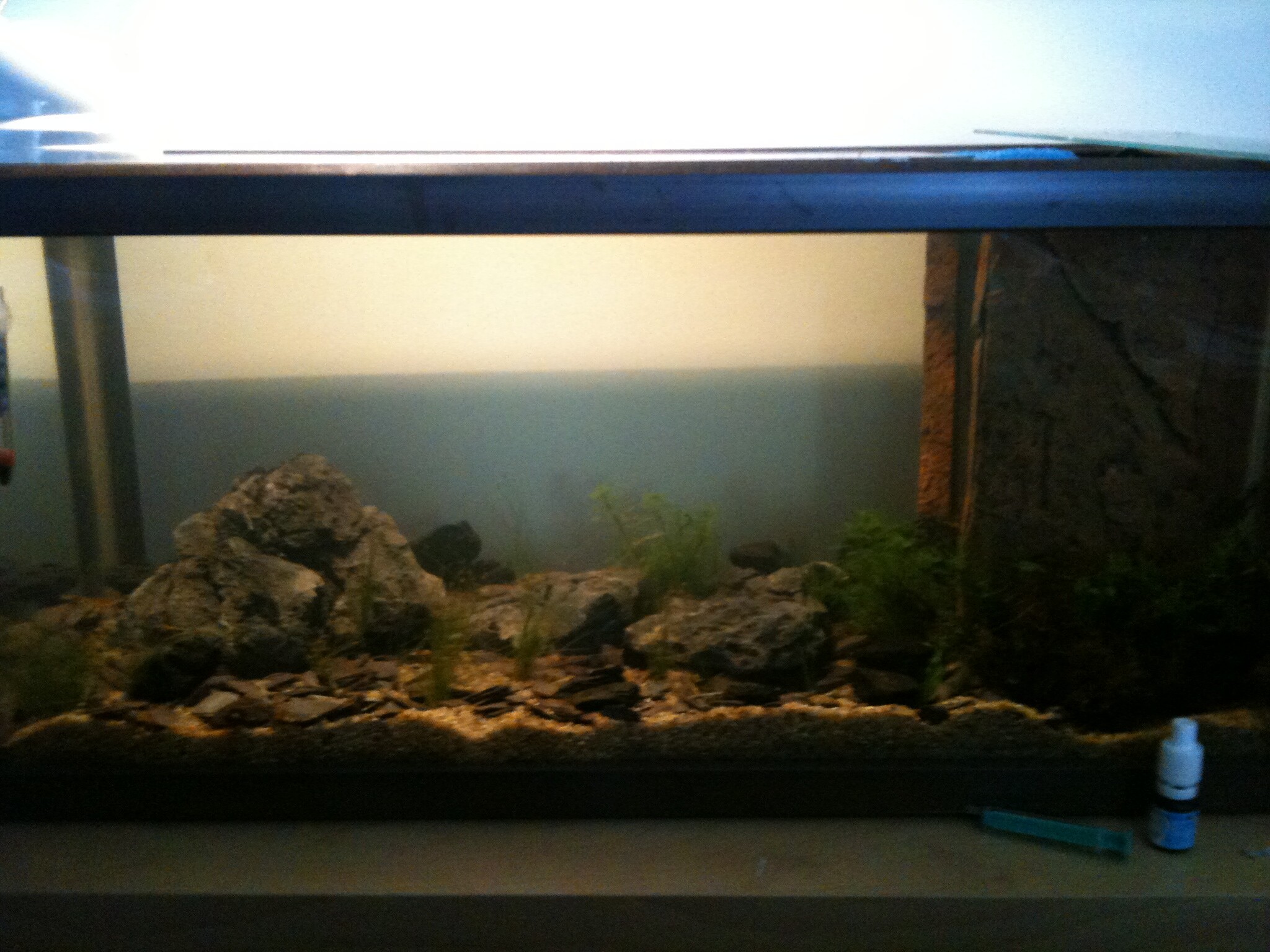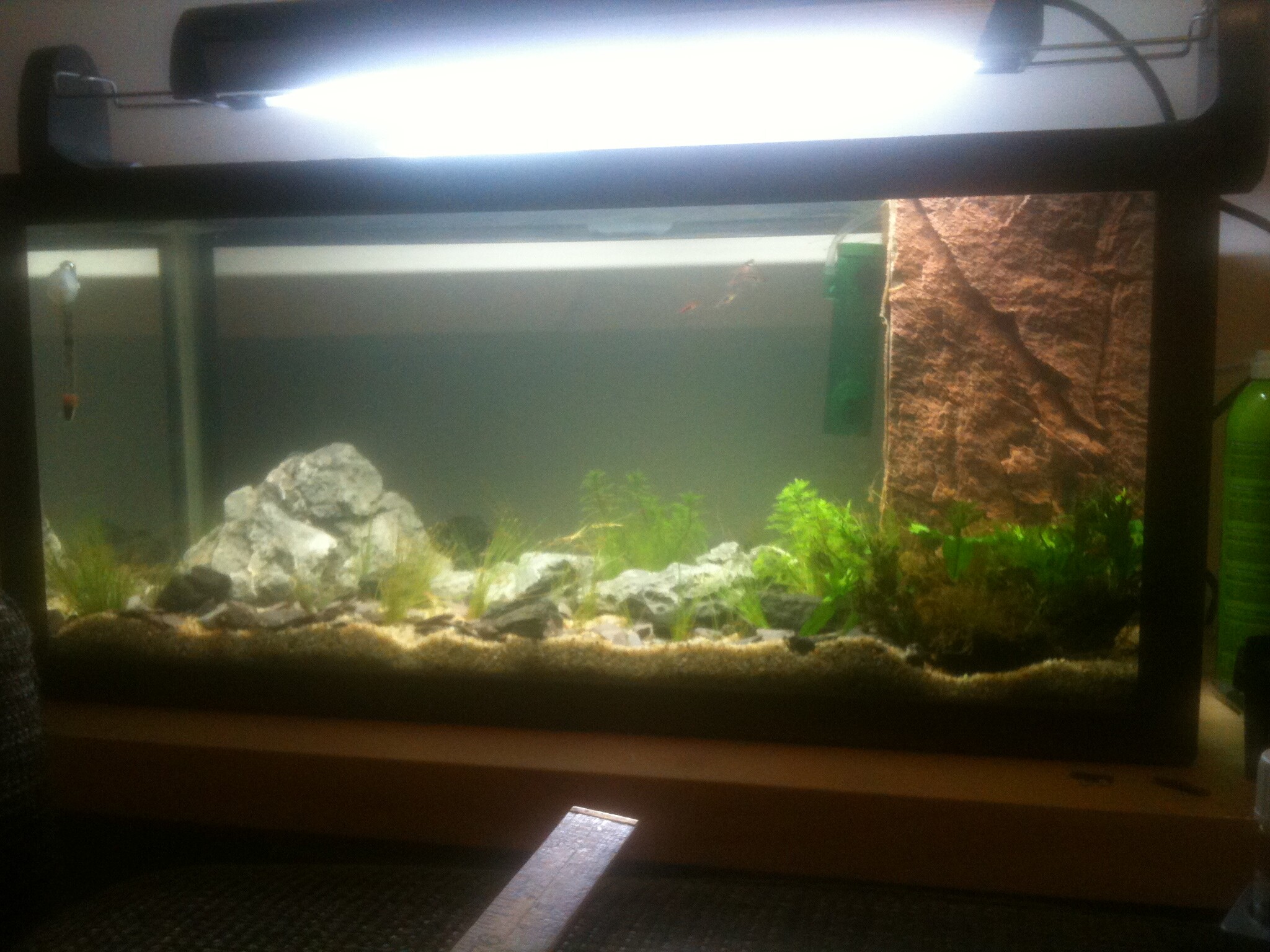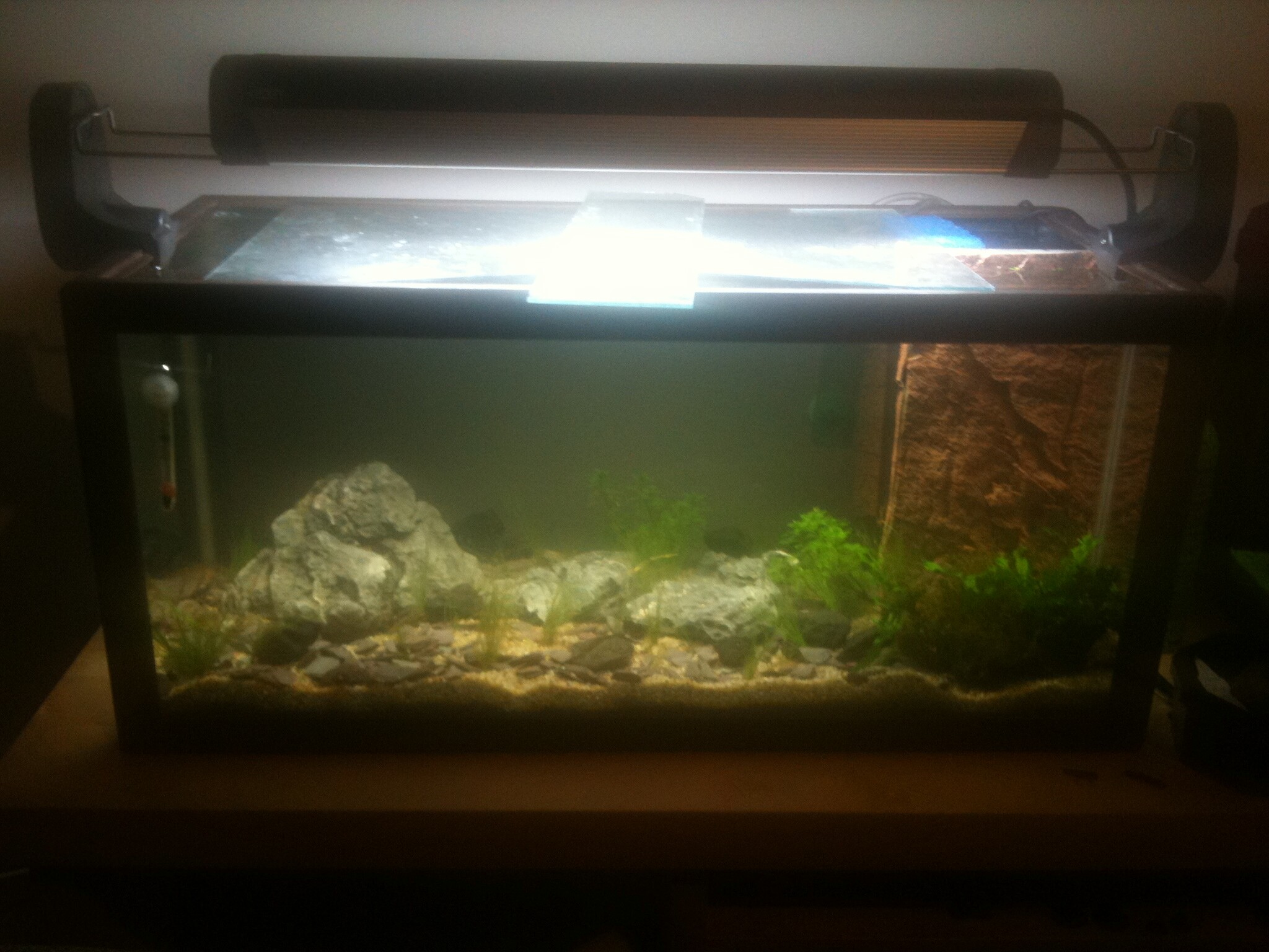 Ännu mer uppdatering. Fick hem min lysramp idag en Power Glo T5 ramp:D och lite Eleocharis Acicularis (gräs). Här har ni några foton(fortf, Iphone kvalité)