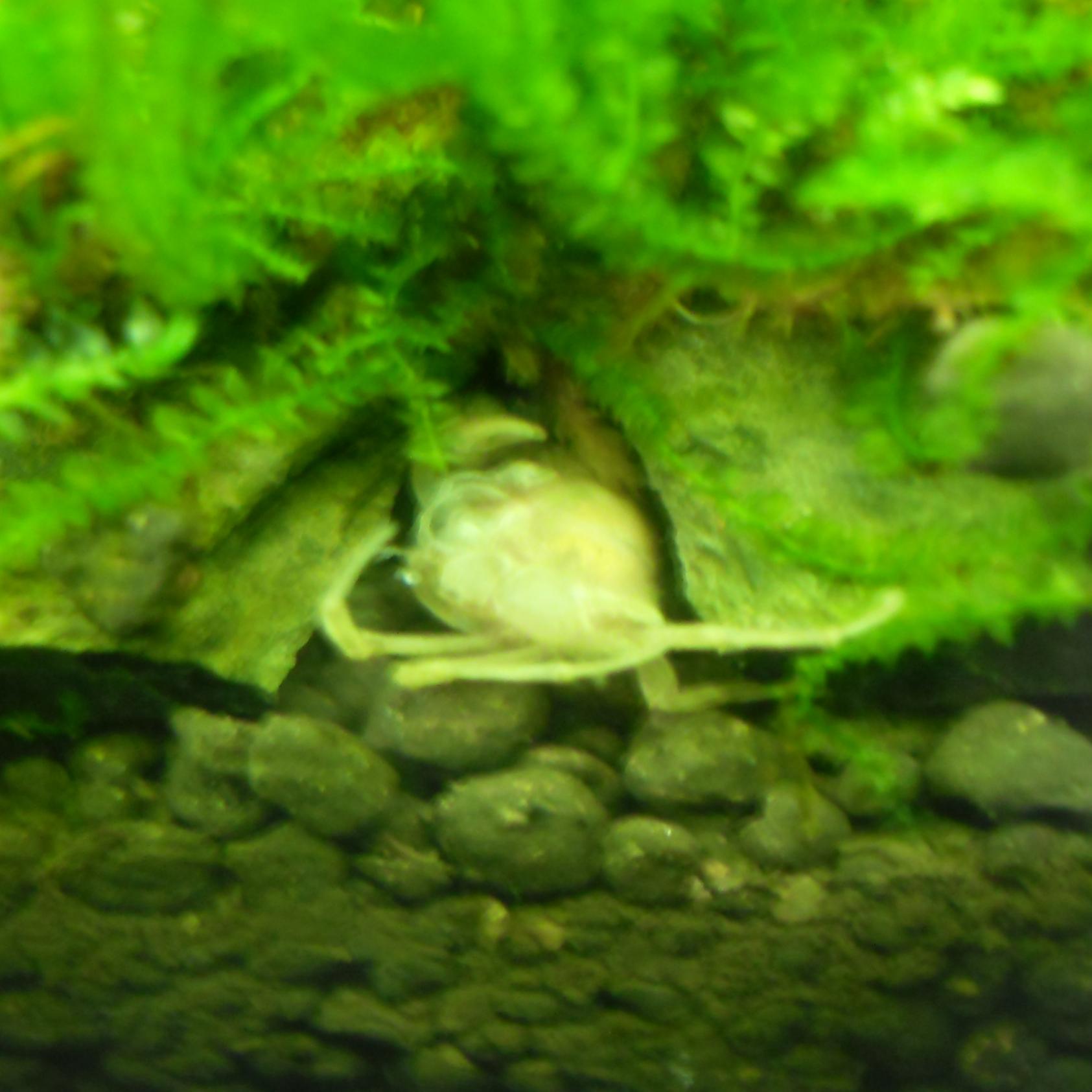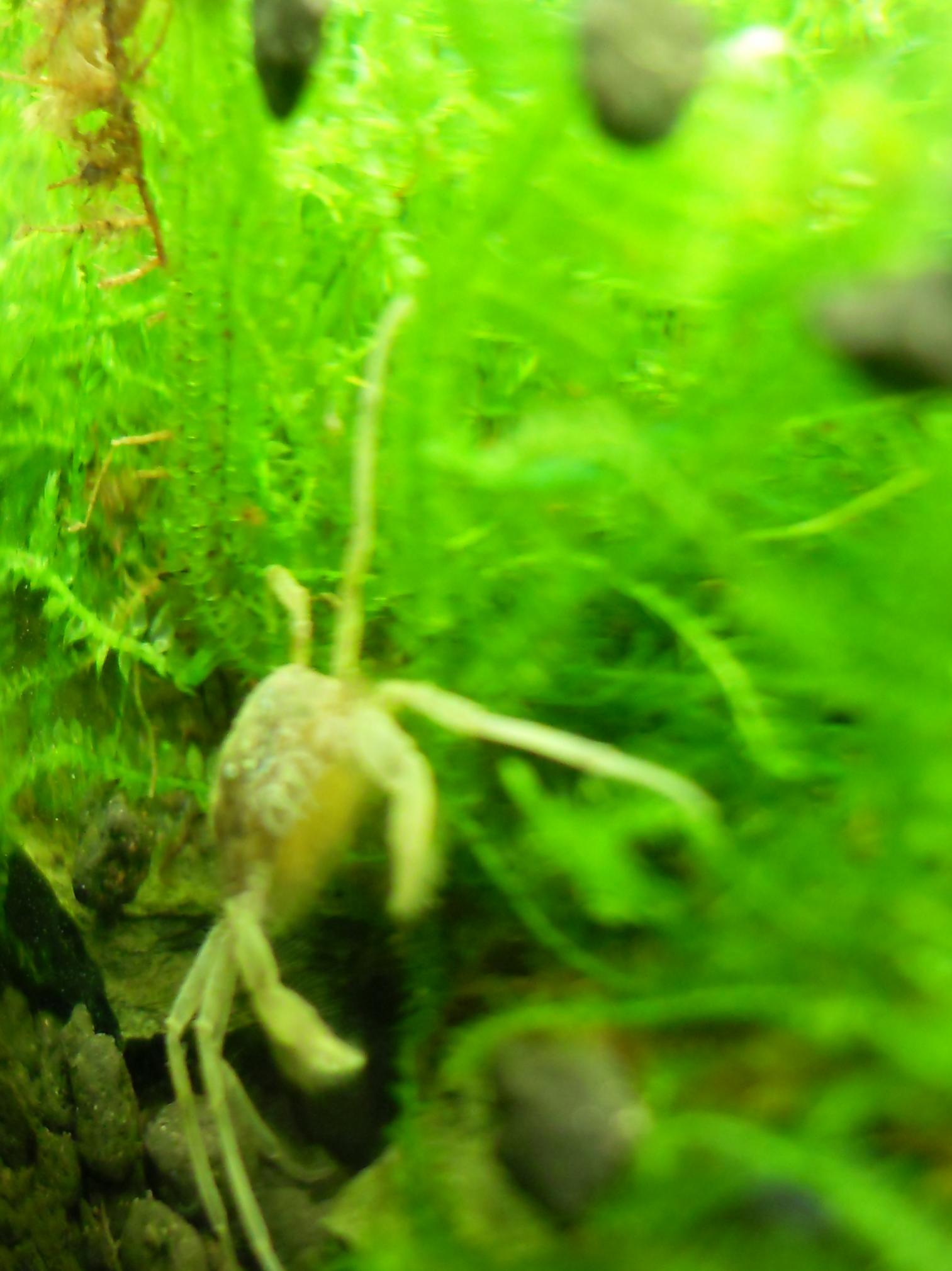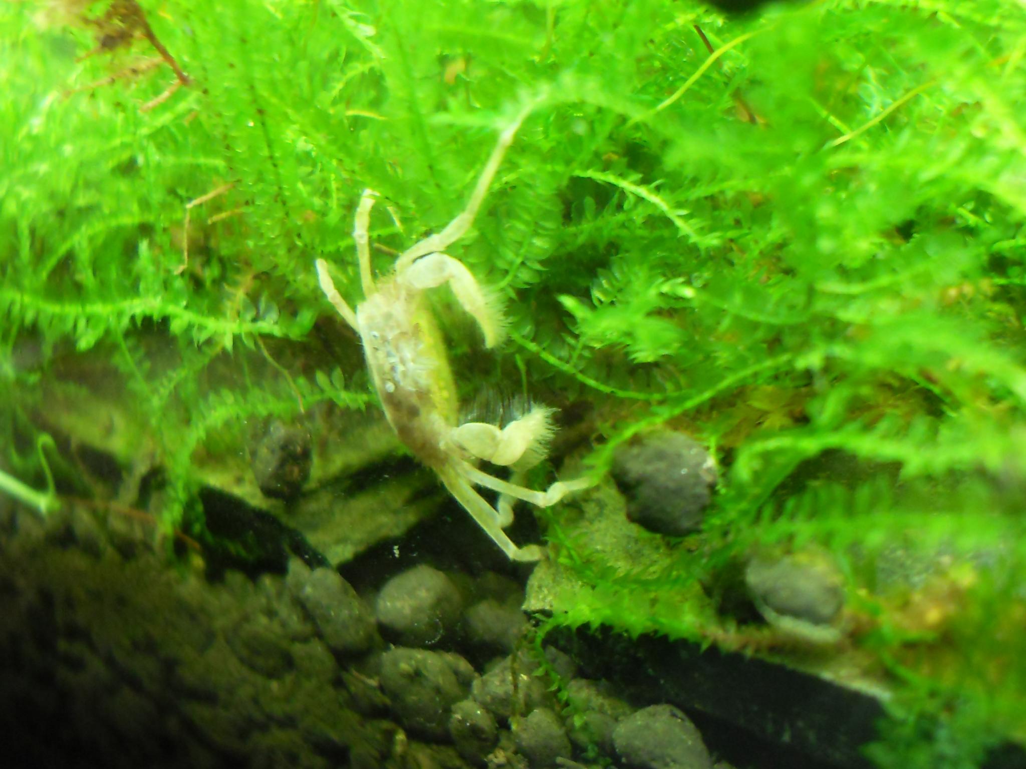 Jag hittade en krabbling i går när jag städade deras kar men den var död tyvärr om det inte är ett ömsskal, med benen var den nog 3 mm och den såg ut som en krabba faktiskt. Funderar på om man kan mata med lite sadako och försöka få det att fastna i flytväxterna, vad tror ni:)?