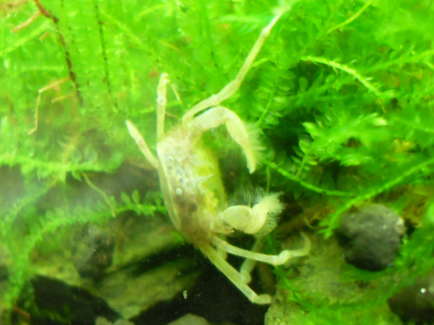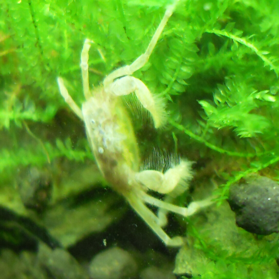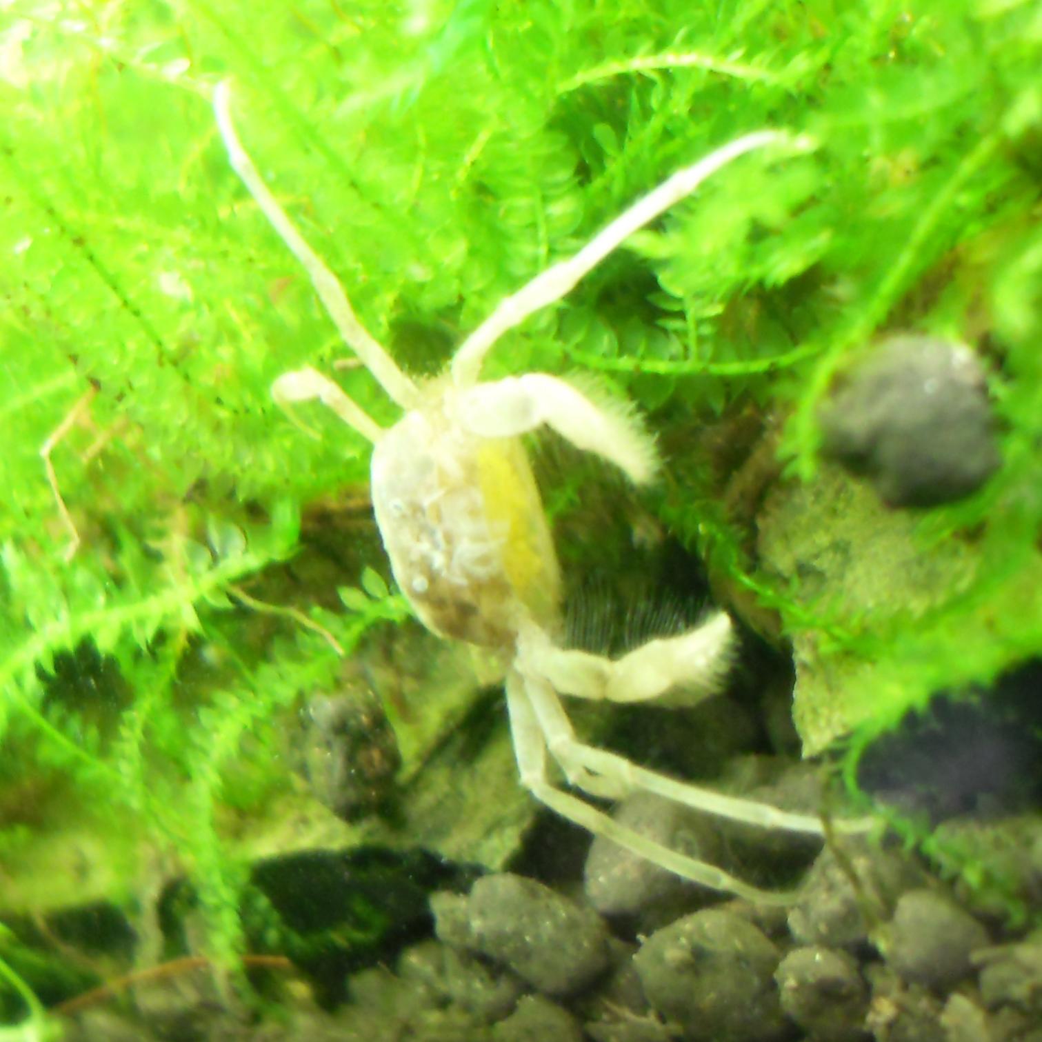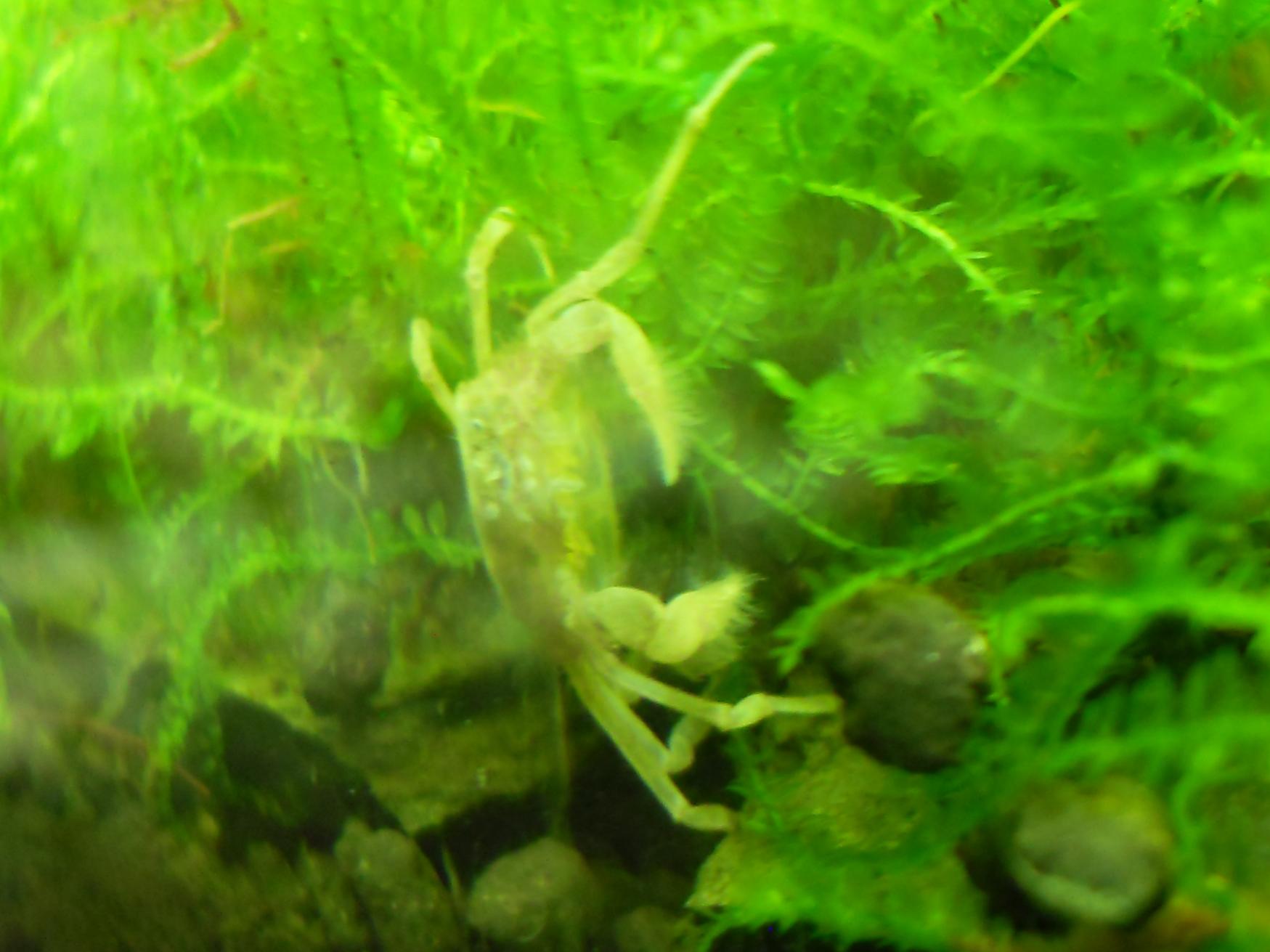 Jag hittade en krabbling i går när jag städade deras kar men den var död tyvärr om det inte är ett ömsskal, med benen var den nog 3 mm och den såg ut som en krabba faktiskt. Funderar på om man kan mata med lite sadako och försöka få det att fastna i flytväxterna, vad tror ni:)?