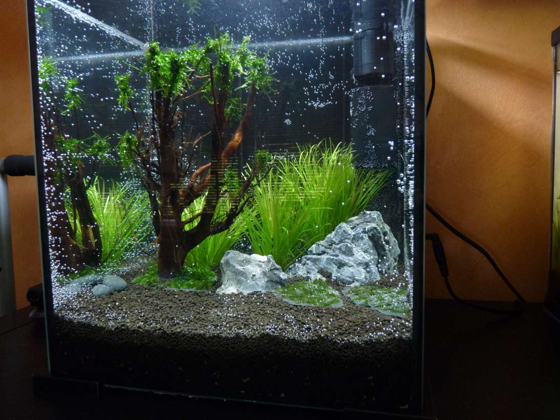 Det där blir nog riktigt snyggt när det är klart. Själv har jag två st AquaEl ShrimpSet 20 och är jättenöjd med pumparna där. Det är riktigt bra ös och dom är ställbara och helt räksäkra. Otroligt tysta med! Ett snyggt och lättplacerat designakvarium. ![]()