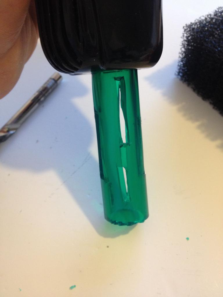 Därefter göra nya öppningar i plaströret med en mattkniv så att jag får ett jämnt sug igenom den yttre filtersvampen.