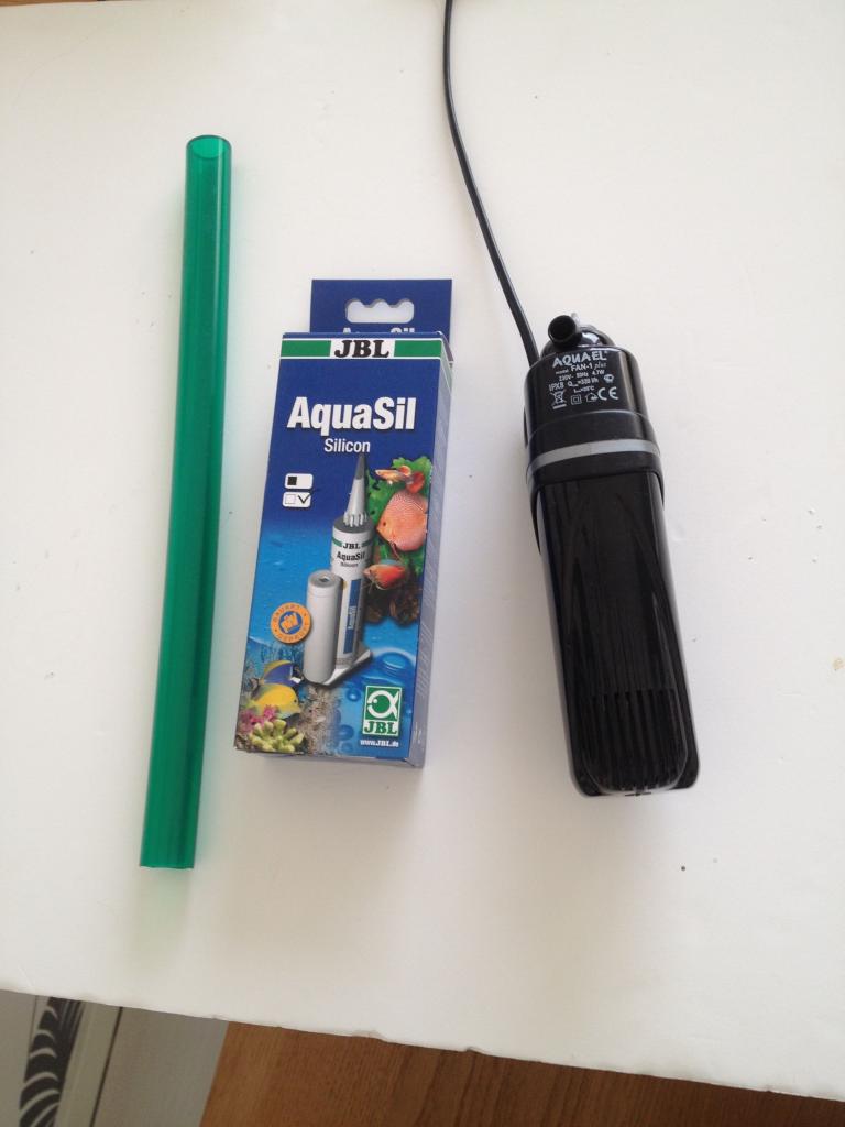 [li]En bit plaströr[/li][li]Silicone[/li][li]1st pump att modda :D[/li][/ul]Se bara till att ovanstående är anpassat för akvariebruk