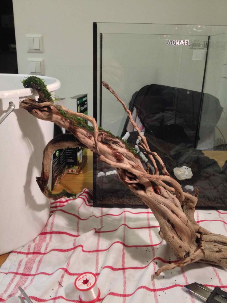 Satt uppe föregående natt och började lite med inredningen. Insåg ganska snabbt att scapa ett kar tar mycket längre tid än vad man tror speciellt om man vill fästa mossa med fiskelina på en rot…pill i pill