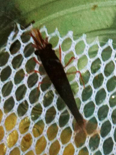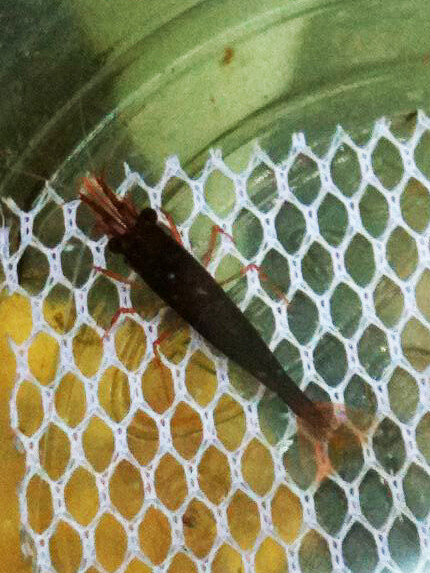 Häromveckan beställde jag lite kardinalräkor och det följde med en helsvart räka (utan prickar eller vita ben men samma morfologi).