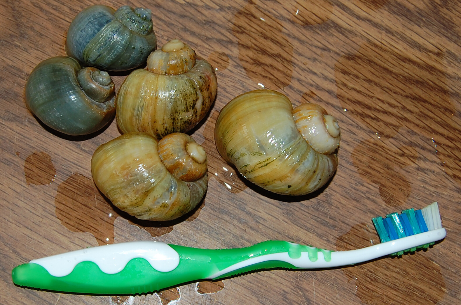 Här kommer en bild på hur stora mina “stora” snäckor är har ju några som är mindre också men de behöver inte denna skönhets behandling med tandborste, då de sluppit den jobbiga algen