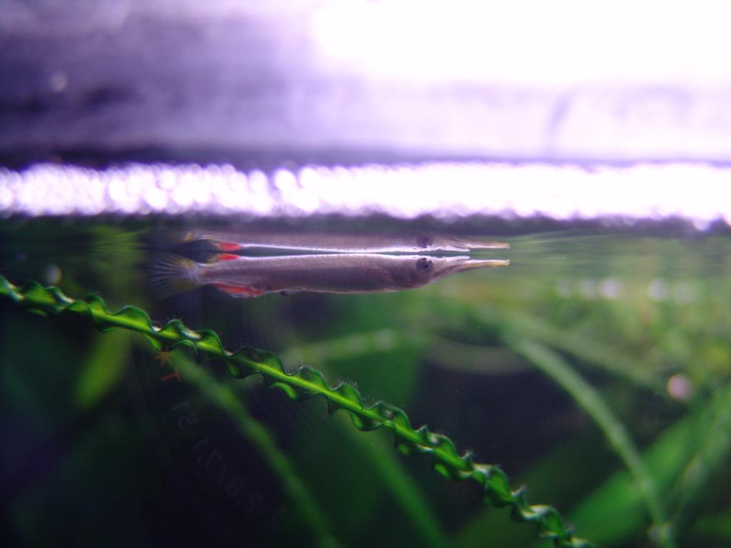 Ser helt klart ut som en Dermogenys, men jag är osäker på art. Har kommit in en del nya i handeln på senare år. Spelar nog ingen roll, de beter sig likadant vad jag vet. Tror inte de ger sig på annat än mindre fiskyngel som går vid ytan, som ovan, de är extremt ytorienterade. Inte direkta rovfiskar, mer insektsätare. Täckglas på, de hoppar lätt ur burken. Kan vara kräsna med maten, insekter ska vara en höjdare. Om man vill odla dem och hålla liv i stammen länge ska det vara viktigt med bra foder (enligt Pinter). Stammen degenererar tydligen lätt annars, dödfödda yngel med mera. En del Dermogenys ska trivas bättre med lite salt, men vad jag vet finns även rent sötvattenslevande arter. En specifik grej med dem är att de lätt skadar käken - blir de skrämda drar de iväg en bra bit och simmar då lätt in i glaset. Udda men rolig fisk, tycker jag.