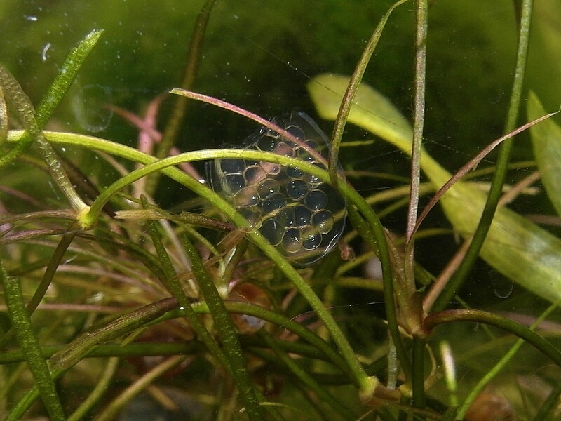 Äggsamlingarna lägger de helst på skyddade platser, jag har för mig att det kan två veckor innan de kläcks, även nykläckta ungar är svåra att upptäcka i inredda akvarier.